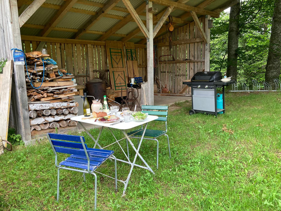 Aussenbereich mit gedecktem Unterstand, Gartenmöbel und Gasgrill